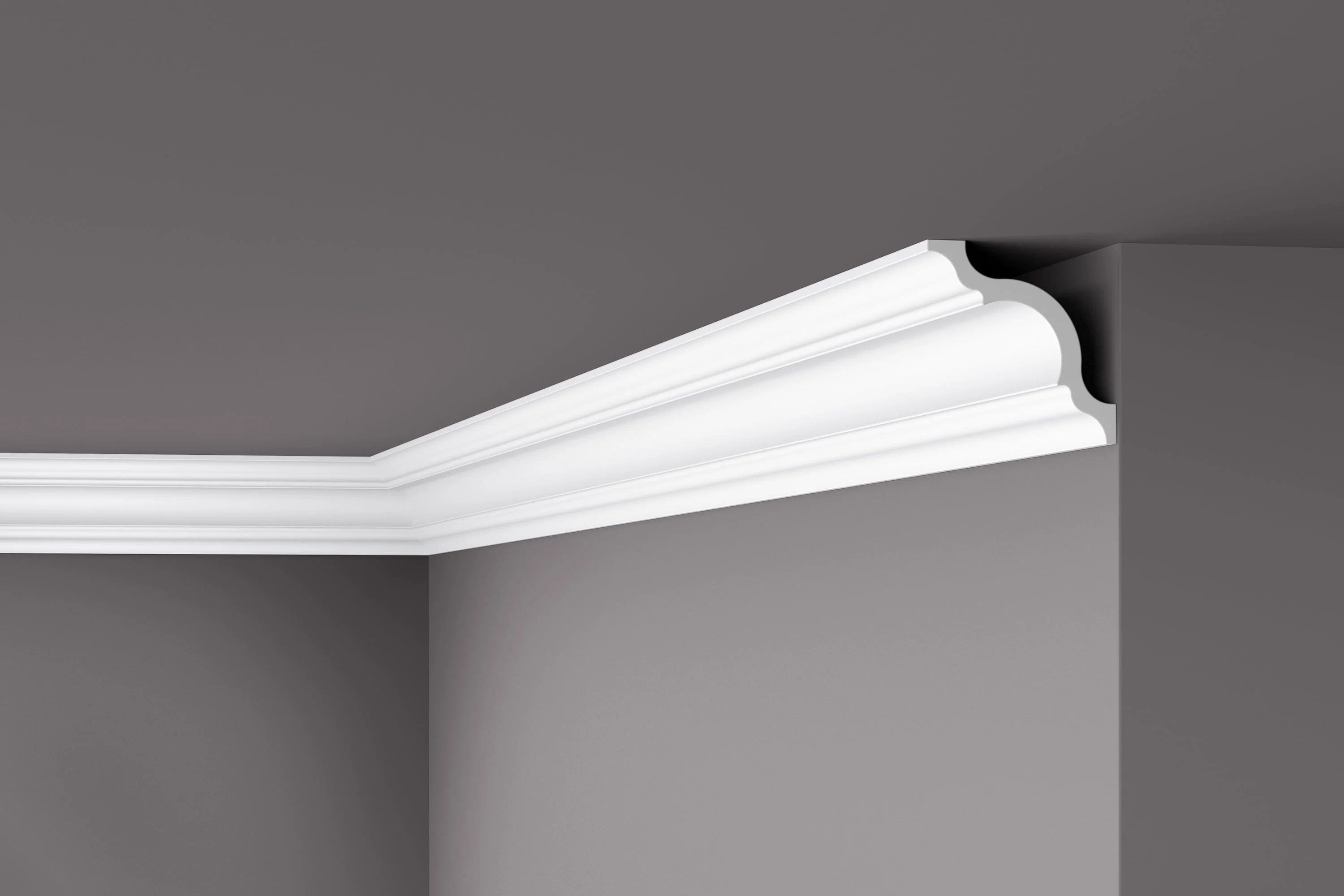 Die A NOMASTYL® Deckenleiste bietet Raum, um Kabel, kleine Risse und Unebenheiten zu verbergen. Dank des wasserfesten Polystyrols ist sie außerdem geeignet, um in Feuchträumen installiert zu werden.